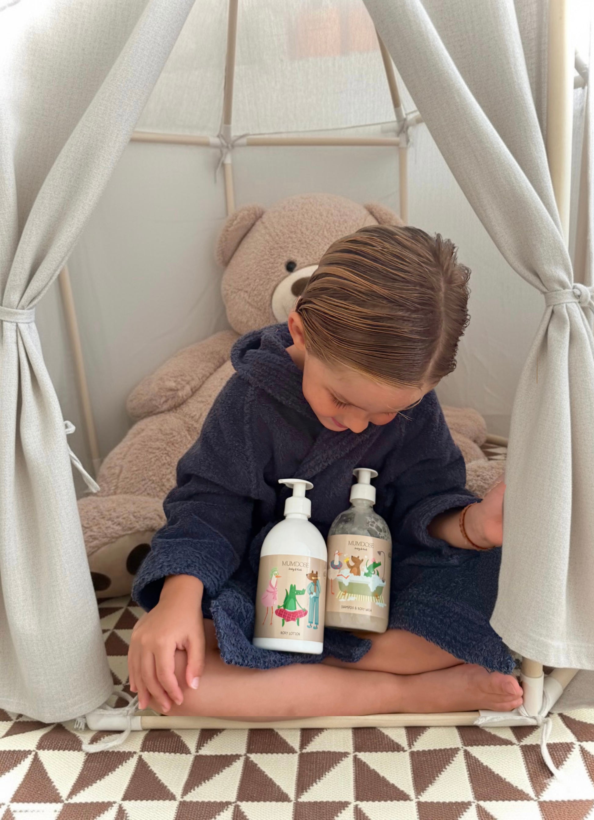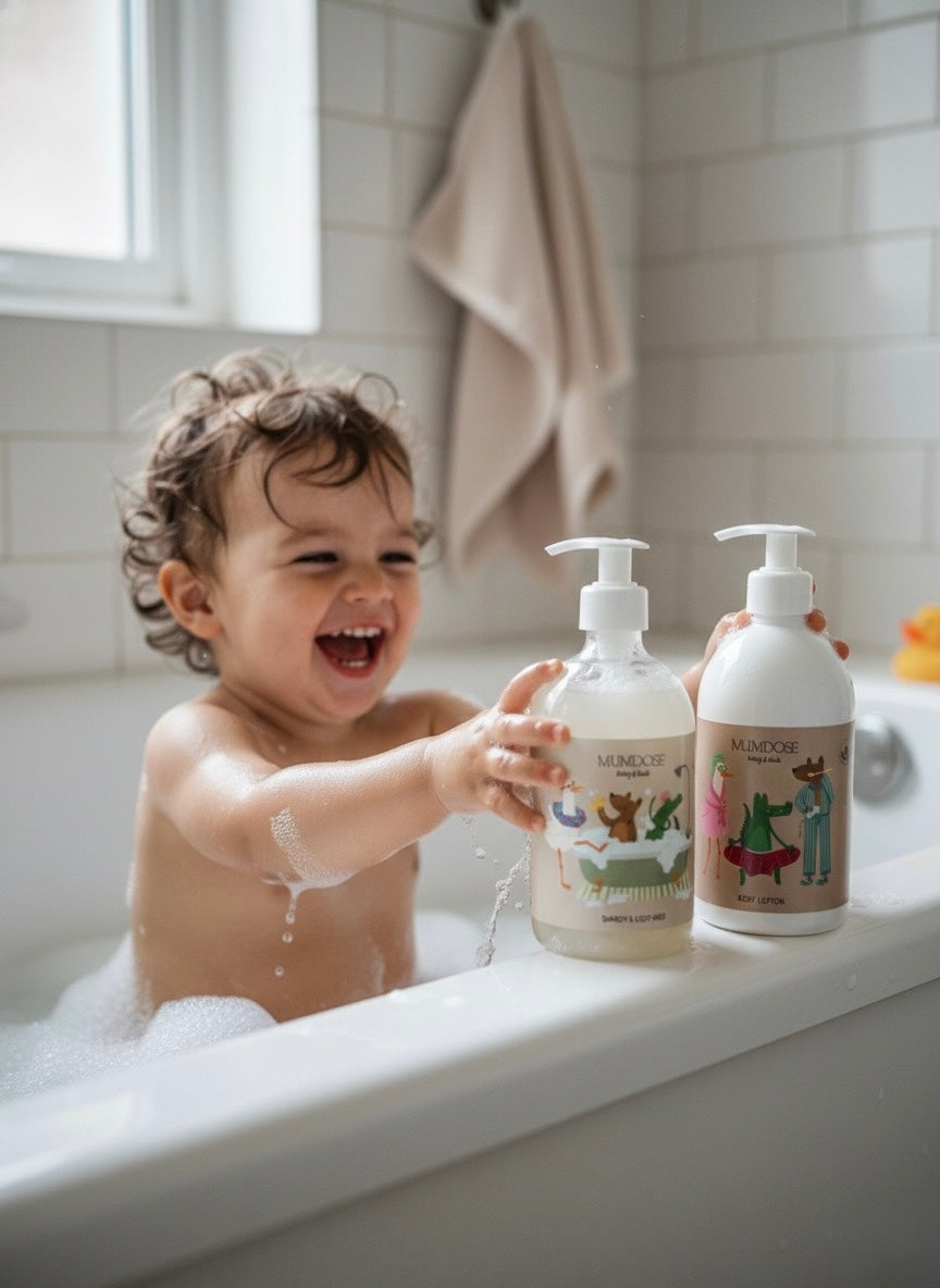 Incluye nuestro gel & champú 2 en 1 CLOUD WASH y la loción corporal MAGIC LOTION, formulados para limpiar e hidratar con suavidad.