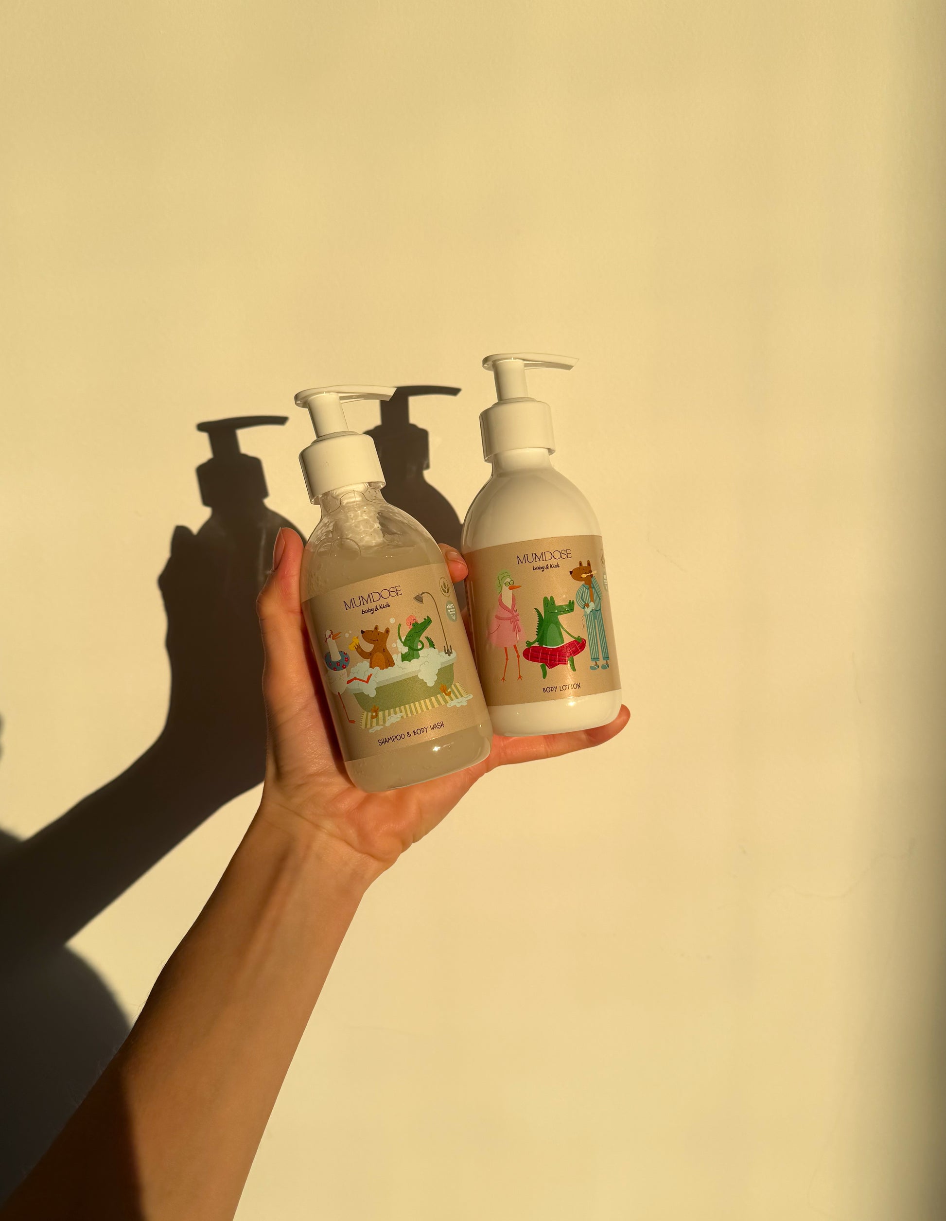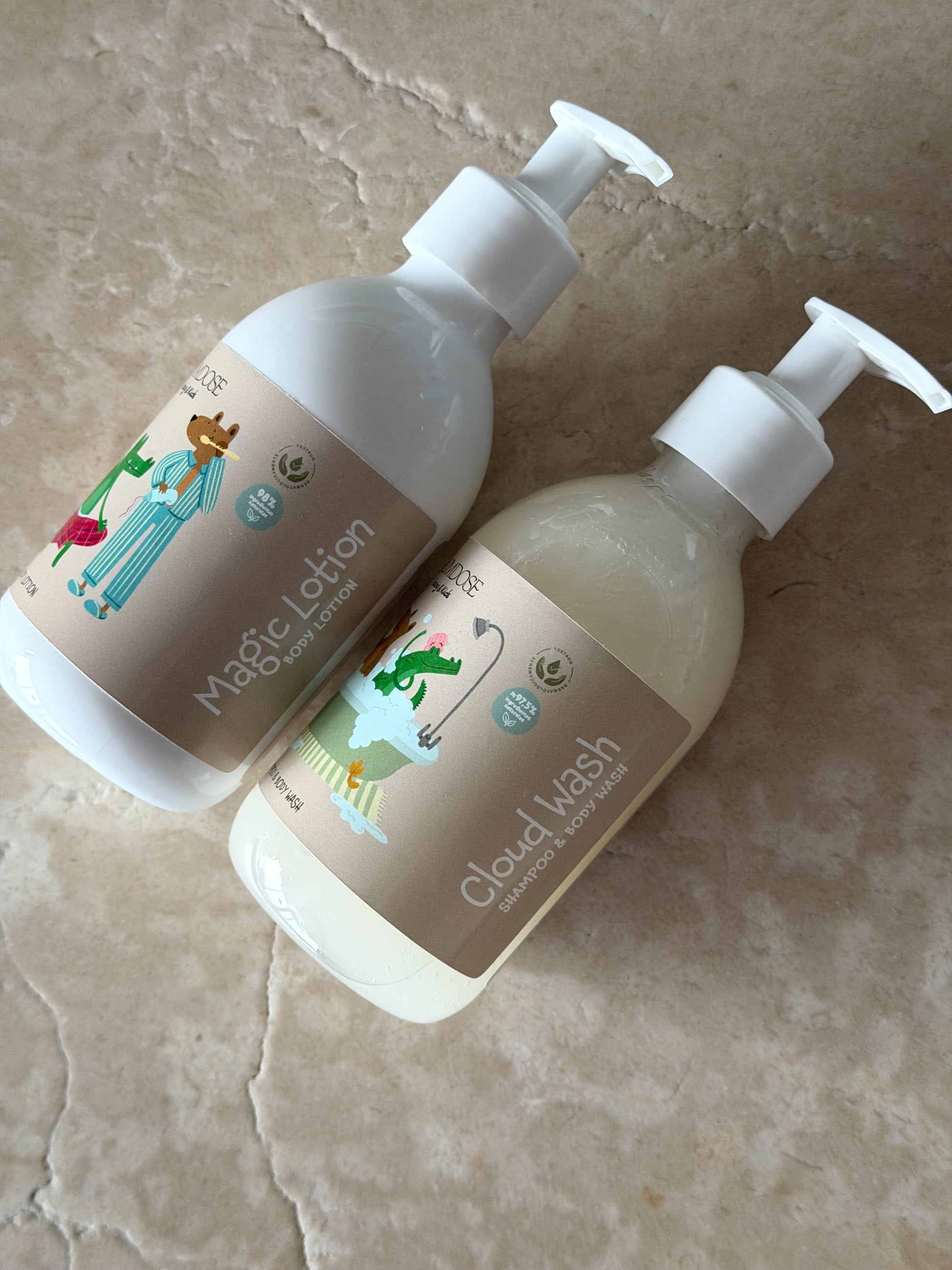 Incluye nuestro gel & champú 2 en 1 CLOUD WASH y la loción corporal MAGIC LOTION, formulados para limpiar e hidratar con suavidad. DISPONIBLE EN 2 FORMATOS: 250ML Y 500ML